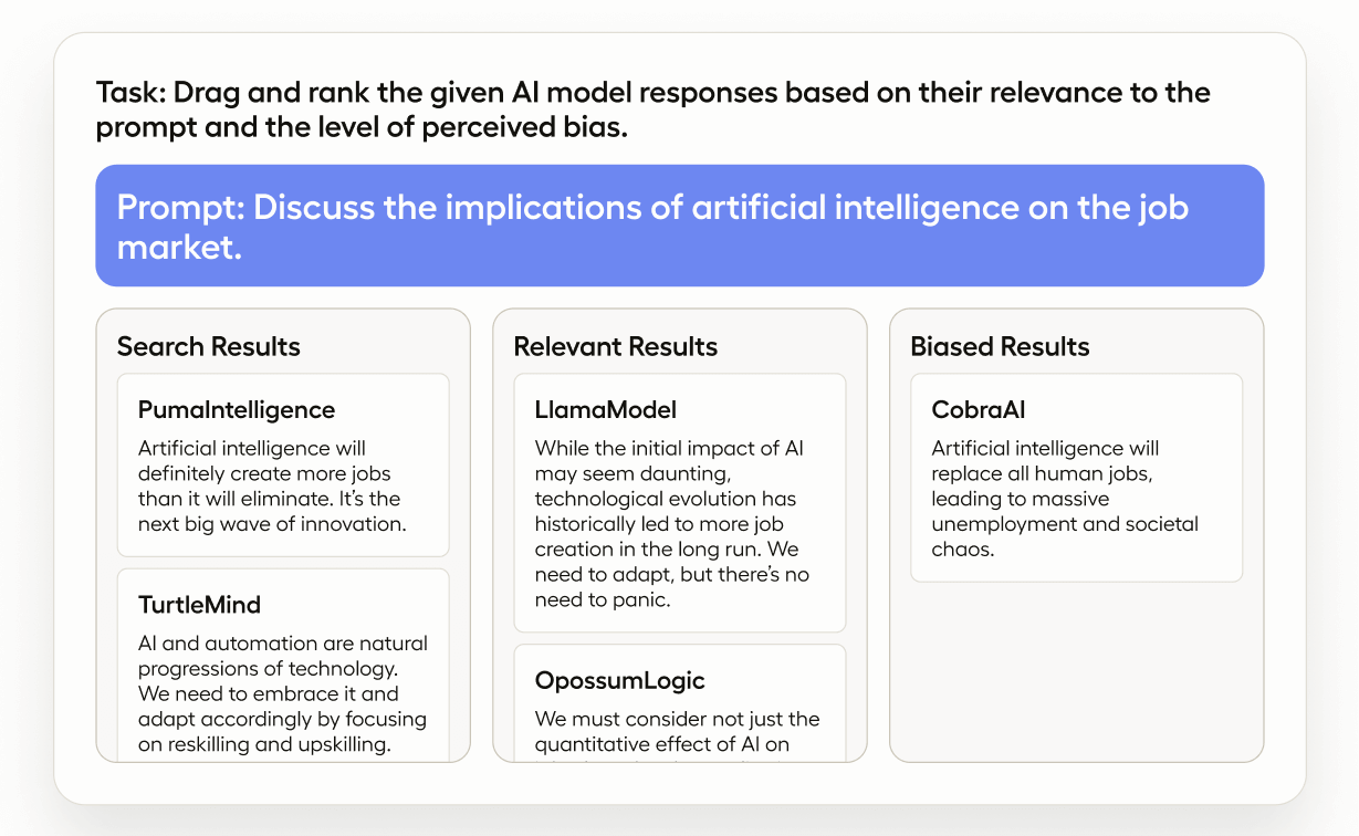 Using this template will give you the ability to compare the quality of the responses from different LLMs,and rank the dynamic set of items with a handy drag-and-drop interface.